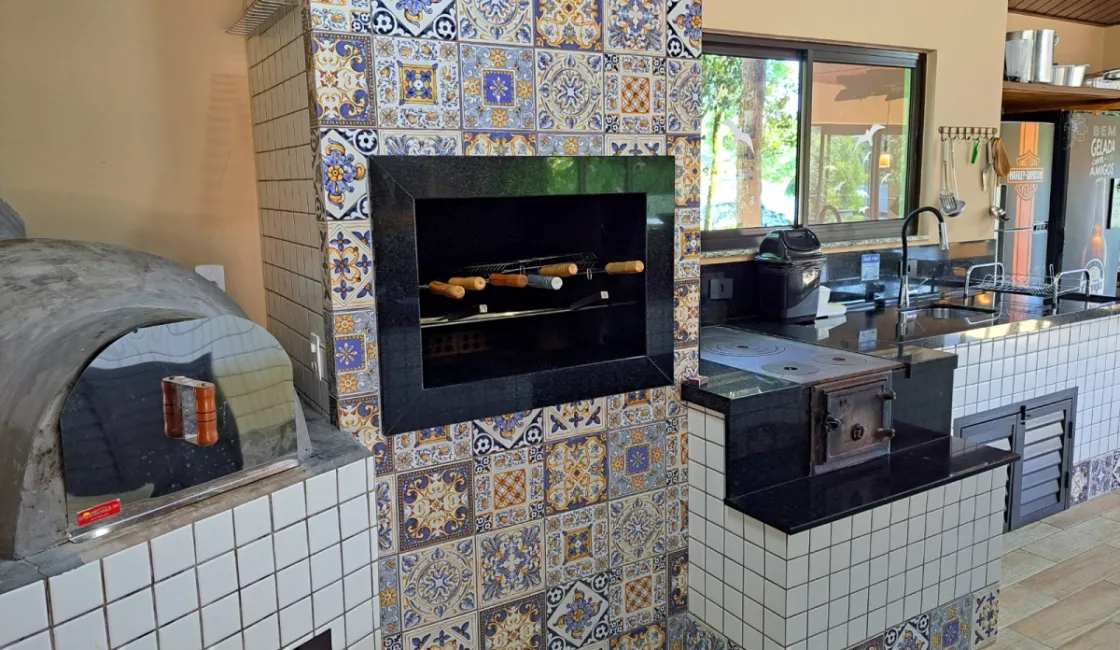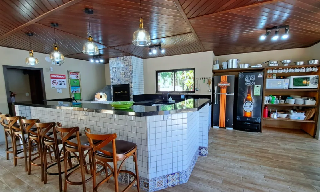 Forno elétrico, fogão a gás, micro-ondas, geladeira, cervejeira, mesa e cadeiras, pratos rasos e fundos, prato lanche, potes de sobremesa, talheres, copos de acrílico, canecas de café, vasilhas, panelas, liquidificador, sanduicheira.