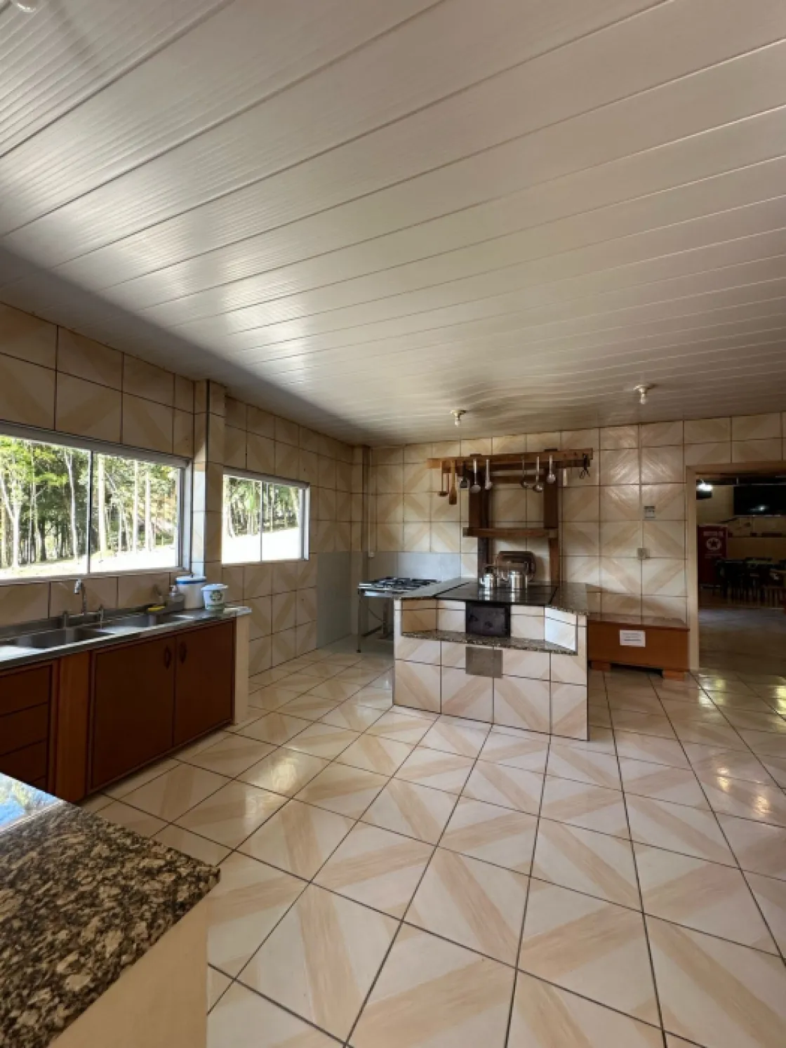 Forno elétrico, fogão a gás, fogão a lenha, micro-ondas, geladeira, cervejeira, mesa e cadeiras, pratos rasos e fundos, prato lanche, potes de sobremesa, talheres, copos de acrílico, canecas de café, vasilhas, panelas, liquidificador, sanduicheira.